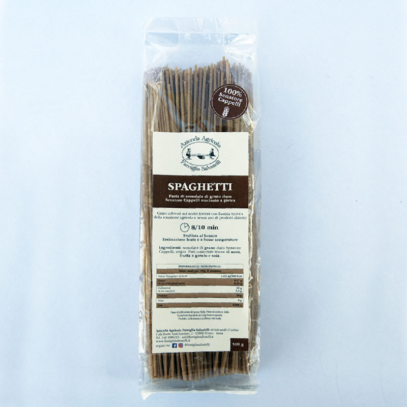 Famiglia Salvatelli li propone nella versione di semolato di grano duro Senatore Cappelli macinato a pietra, trafilata al bronzo ed essiccata lentamente a basse temperature.