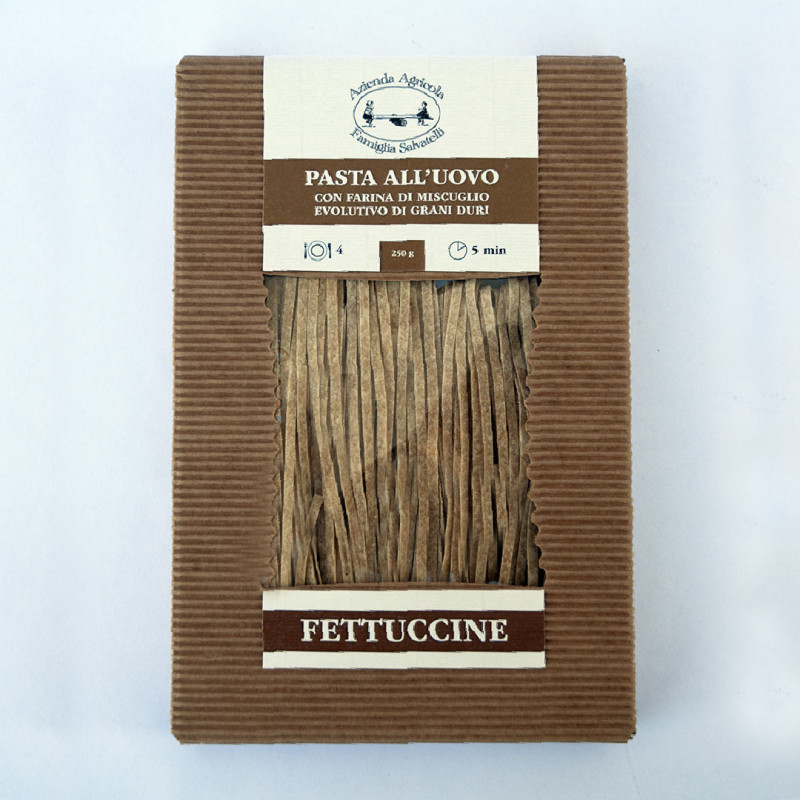 Tipiche del centro Italia e tra i formati di paste all'uovo più famosi ed apprezzati, le fettuccine Famiglia Salvatelli hanno uno spessore equilibrato e straordinaria consistenza per dare vita ad un primo prelibato.